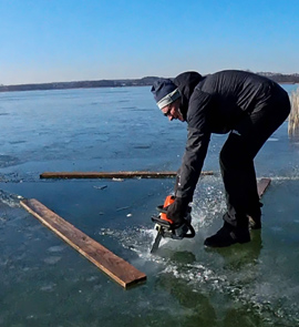 Po dotarciu na miejsce przywitała nas słoneczna pogoda i dobre humory. Zabraliśmy się do wycinania przerębla, przygotowania sprzętu i podpięcia linek bezpieczeństwa